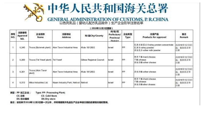 2018年12月5日,中华人民共和国海关总署官网发布了4家以色列乳品(婴幼儿配方乳品除外)生产企业在华注册名单(首次)。其中三家来自以色列乳业巨头Tnuva集团下属的三家工厂 (Ba'emek plant)、 (Tel Yosef plant)和(Alon Tavorplant)。另外一家则是Milco Industries Ltd。